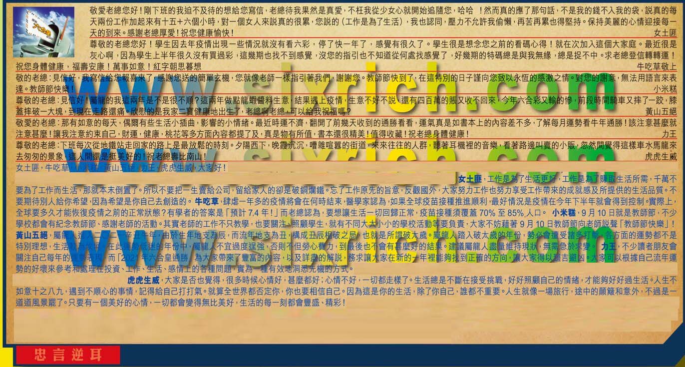 【2】.尊敬的老總您好!學生因去年疫情出現一些情況就沒有看六彩,停了快一年了,感覺有很久了。學生很是想念您之前的看碼心得!就在次加入這個大家庭。最近很是灰心啊,因為學生上半年很久沒有買過彩,這幾期也找不到感覺,沒您的指引也不知道從何處找感覺了,好幾期的特碼總是與我無緣,總是捉不中。求老總登信轉轉運!祝您身體健康,福壽安康!萬事如意!紅字朝思暮想  牛吃草敬上