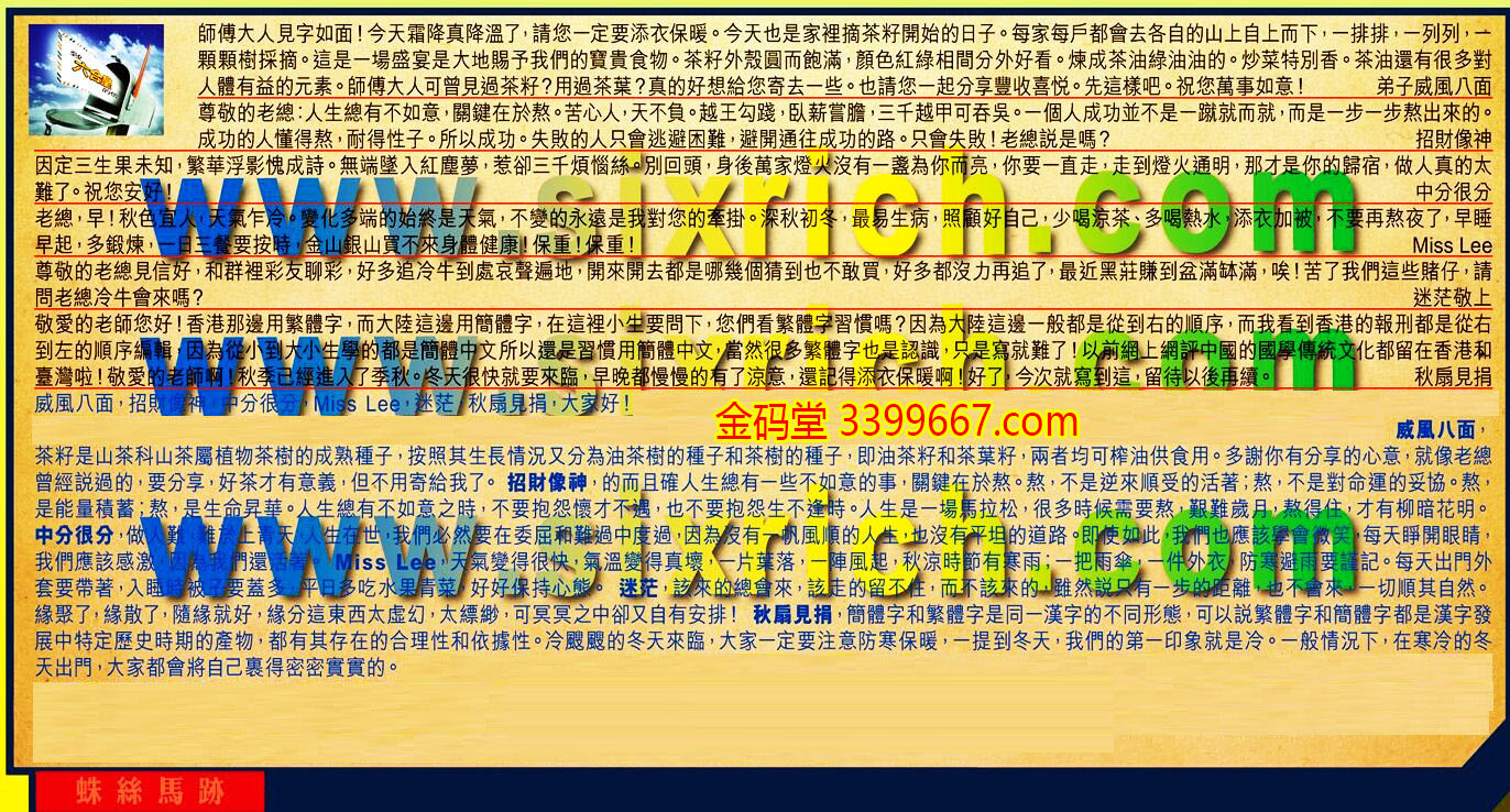 【5】.尊敬的老總見信好,和群裡彩友聊彩,好多追冷牛到處哀聲遍地,開來開去都是哪幾個猜到也不敢買,好多都沒力再追了,最近黑莊賺到盆滿钵滿,唉!苦了我們道些賭仔,請問老總冷牛會來嗎?  迷茫敬上