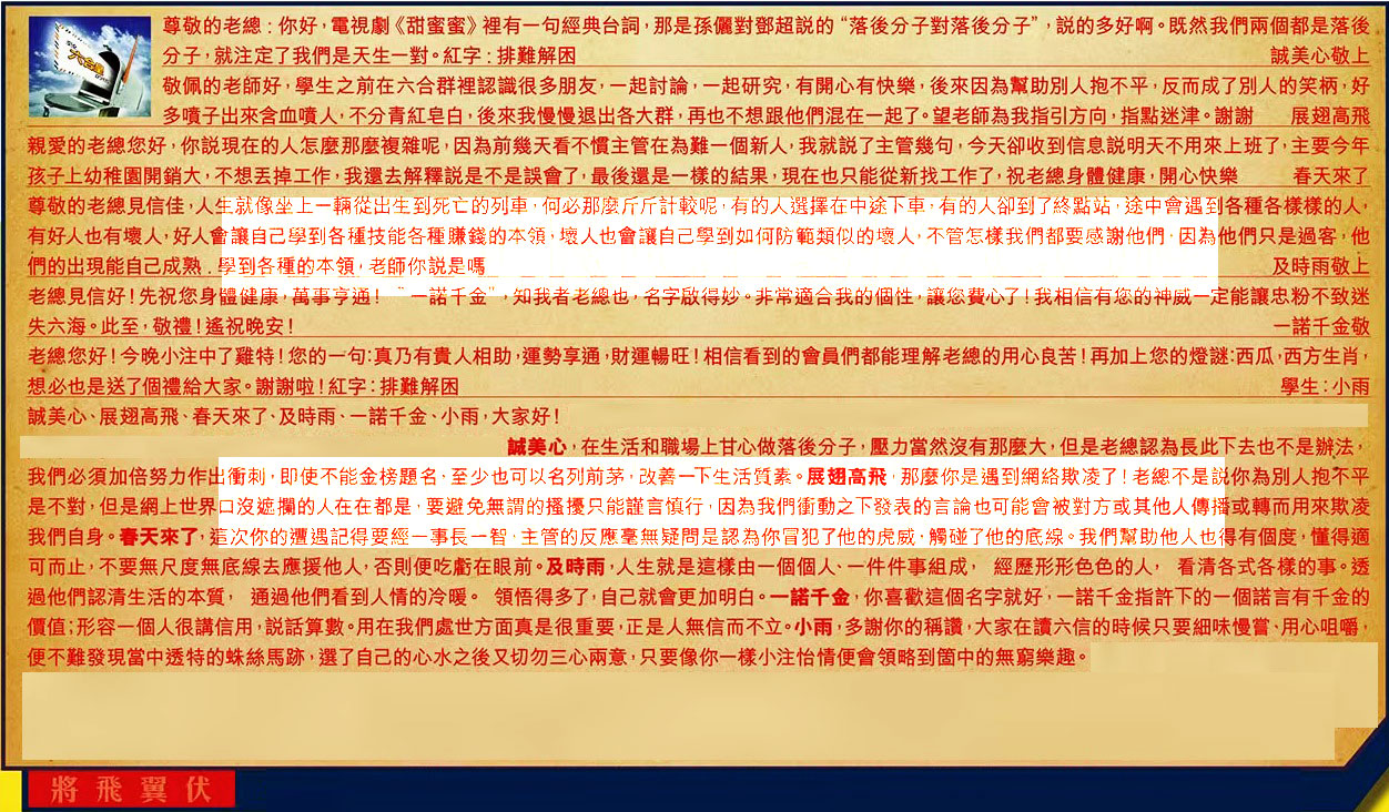 【2】.敬佩的老師好,學生之前在六合群裡認識很多朋友,一起討論,一起研究,有開心有快樂,後來因為幫助別人抱不平,反而成了別人的笑柄,好多喷子出來含血喷人,不分青紅皂白,後來我慢慢退出各大群,再也不想跟他們混在一起了。望老師為我指引方向,指點迷津。謝謝 展翅高飛