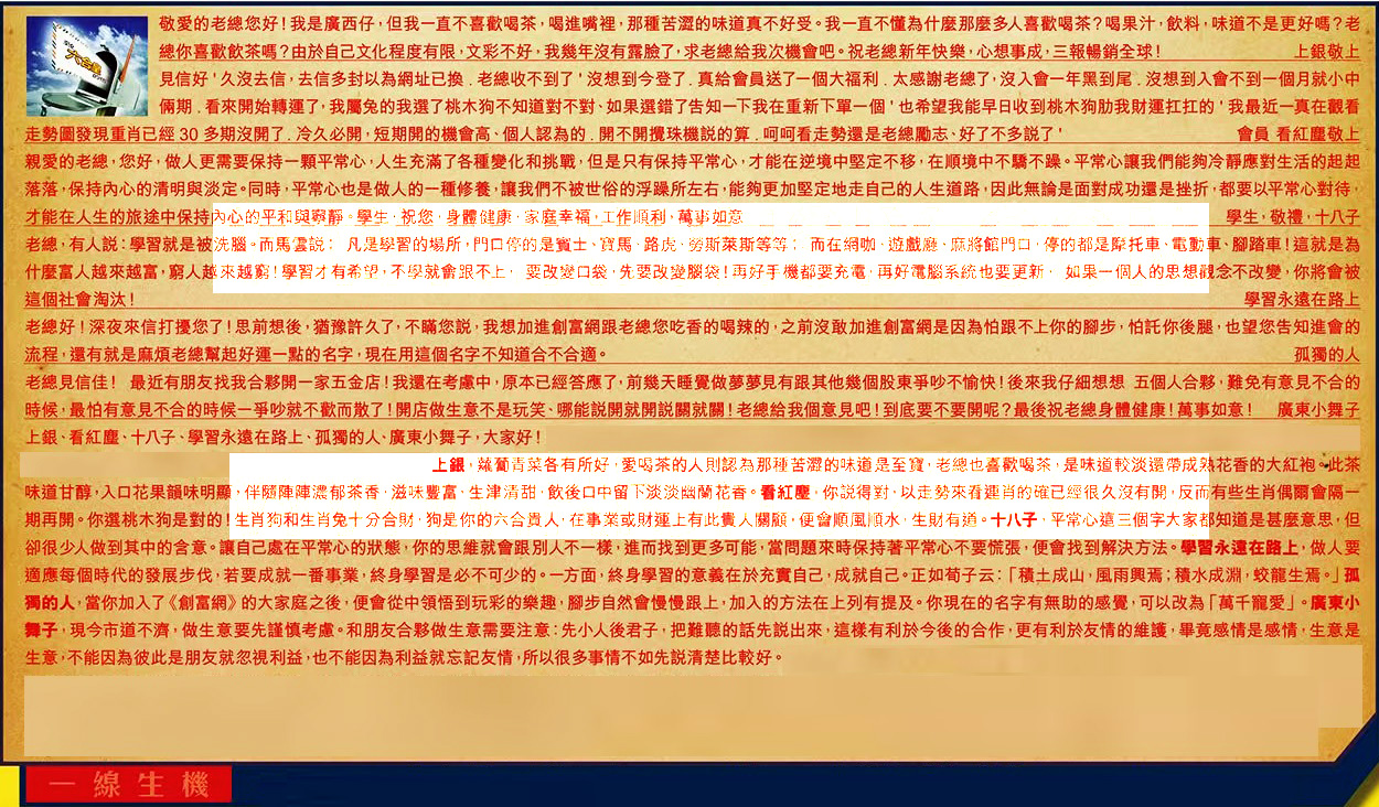 【2】.見信好'久沒去信,去信多封以為網址已換,老總收不到了,沒想到今登了,真給會員送了一個大福利 . 太感謝老總了,沒入會一年黑到尾 . 沒想到入會不到一個月就小中倆期 . 看來開始轉運了,我屬兔的我選了桃木狗不知道對不對、如果選錯了告知一下我在重新下單一 個,也希望我能早日收到桃木狗肋我財運扛扛的,我最近一真在觀看走勢圖發現重肖已經 30 多期沒開了. 冷久必開,短期開的機會高、個人認為的 . 開不開攪珠機說的算 . 呵呵看走勢還是老總勵志、好了不多说了 ' 會員 看紅塵敬上