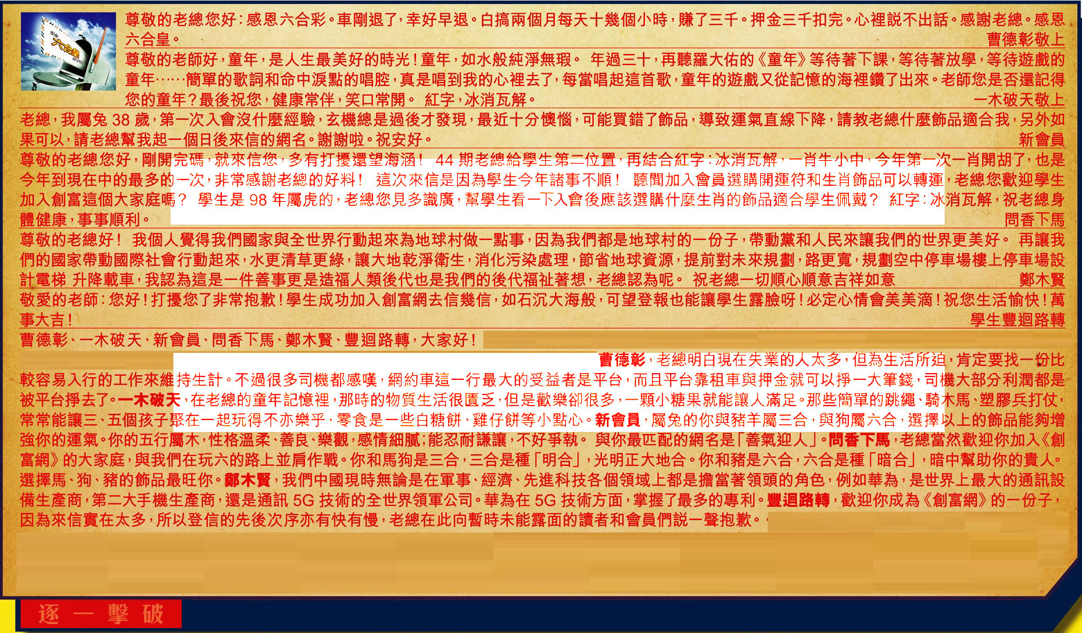 【4】.尊敬的老總您好,剛開完碼,就來信您,多有打擾還望海涵!!44 期老總給學生第二位置,再結合紅字:冰消瓦解,一肖牛小中,今年第一次一肖開胡了,也是今年到現在中的最多的一次,非常感謝老總的好料!這次來信是因為學生今年諸事不順!聽聞加入會員選購開運符和生肖飾品可以轉運,老總您歡迎學生加入創富這個大家庭嗎?學生是 98 年属虎的,老總您見多識廣,幫學生看一下入會後應該選購什麼生肖的飾品適合學生佩戴?紅字:冰消瓦解,祝老總身體健康,事事順利。 問香下馬
