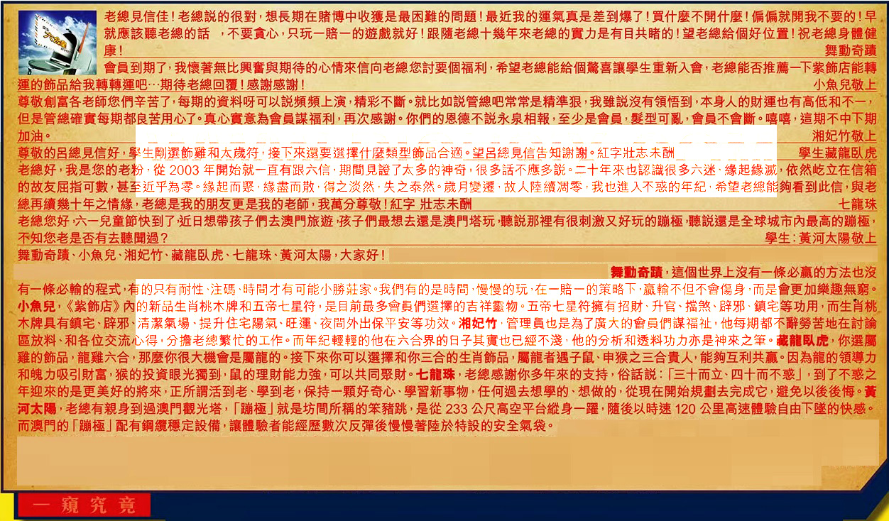 【1】.老總見信佳!老總說的很對,想長期在賭博中收獲是最困難的問題!最近我的運氣真是差到爆了!買什麼不開什麼!偏偏就開我不要的!早就應該聽老總的話,不要貪心, 只玩一賠一的遊戲就好!跟隨老總十幾年來老總的實力是有目共睹的!望老總給個好位置!祝老總身體健康! 舞動奇績