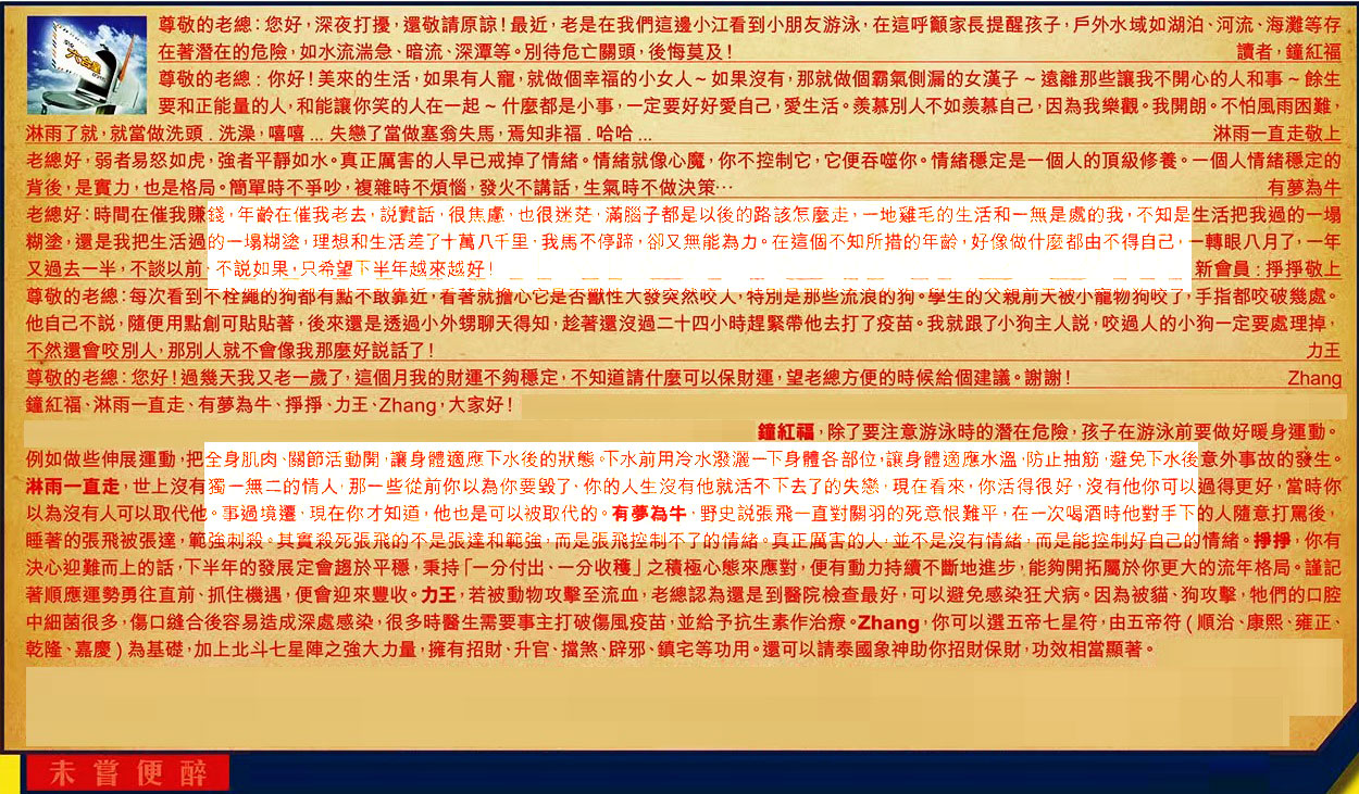 【4】.老總好:時間在催我賺錢,年齡在催我老去,說實話,很焦慮,也很迷茫,滿腦子都是以後的路該怎麼走,一地雞毛的生活和一無是處的我,不知是生活把我過的一塌糊塗,還是我把生活過的一場糊塗,理想和生活差了十萬八千里,我馬不停蹄,卻又無能為力。在這個不知所措的年齡,好像做什麼都由不得自己,一轉眼八月了,一年又過去一半,不談以前,不說如果,只希望下半年越来越好!  新會員:掙掙敬上
