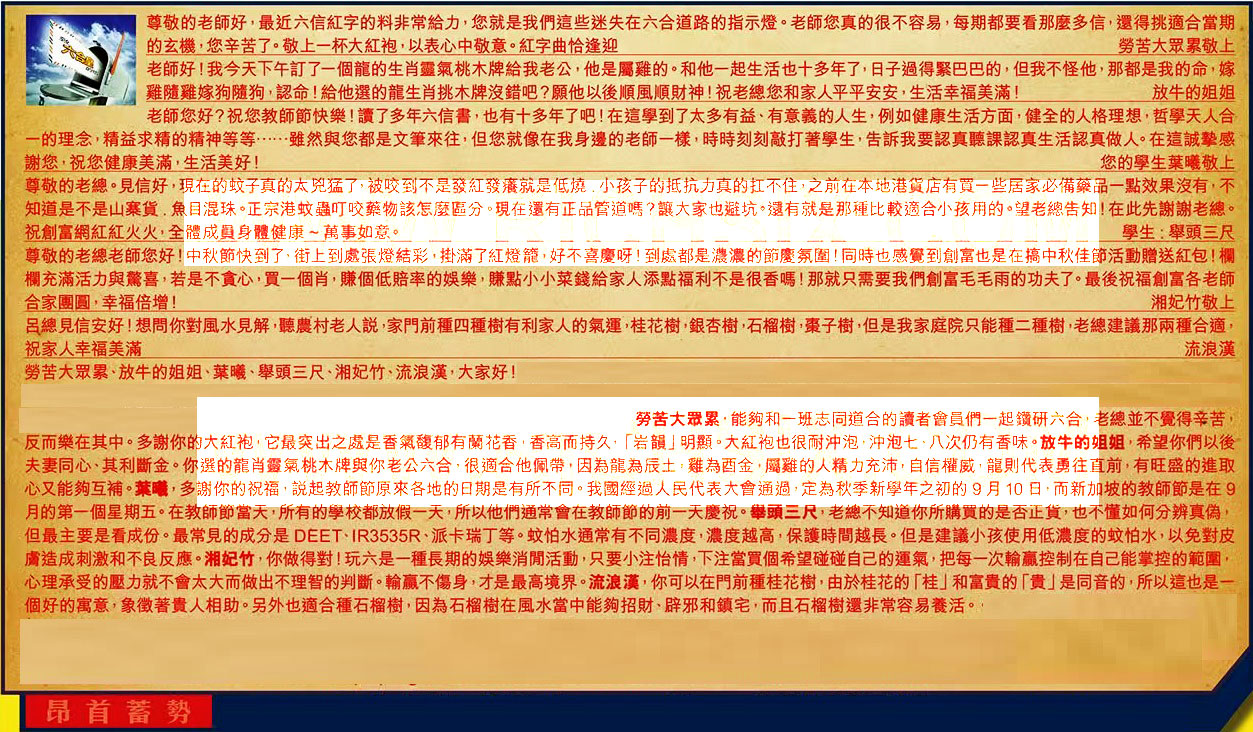 【1】.尊敬的老師好,最近六信紅字的料非常給力,您就是我們這些迷失在六合道路的指示燈。老師您真的很不容易,每期都要看那麼多信,還得挑適合當期的玄機,您辛苦了。敬上一杯大紅袍,以表心中敬意。紅字曲恰逢迎 勞苦大眾累敬上