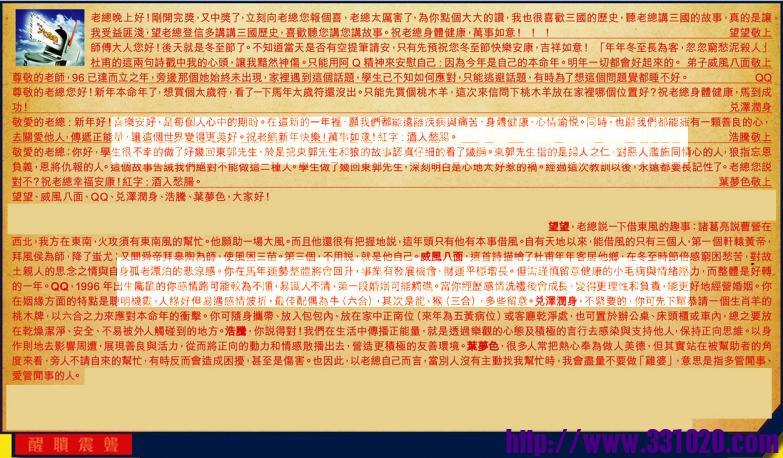 【1】.老總晚上好!剛開完獎,又中獎了,立刻向老總您報個喜,老總太厲害了,為你點個大大的讃,我也很喜歡三國的歷史,聽老總講三國的故事,真的是讓我受益匪淺,望老總登信多講講三國歷史,喜歡聽您講您講故事。祝老總身體健康,萬事如意!!! 望望敬上